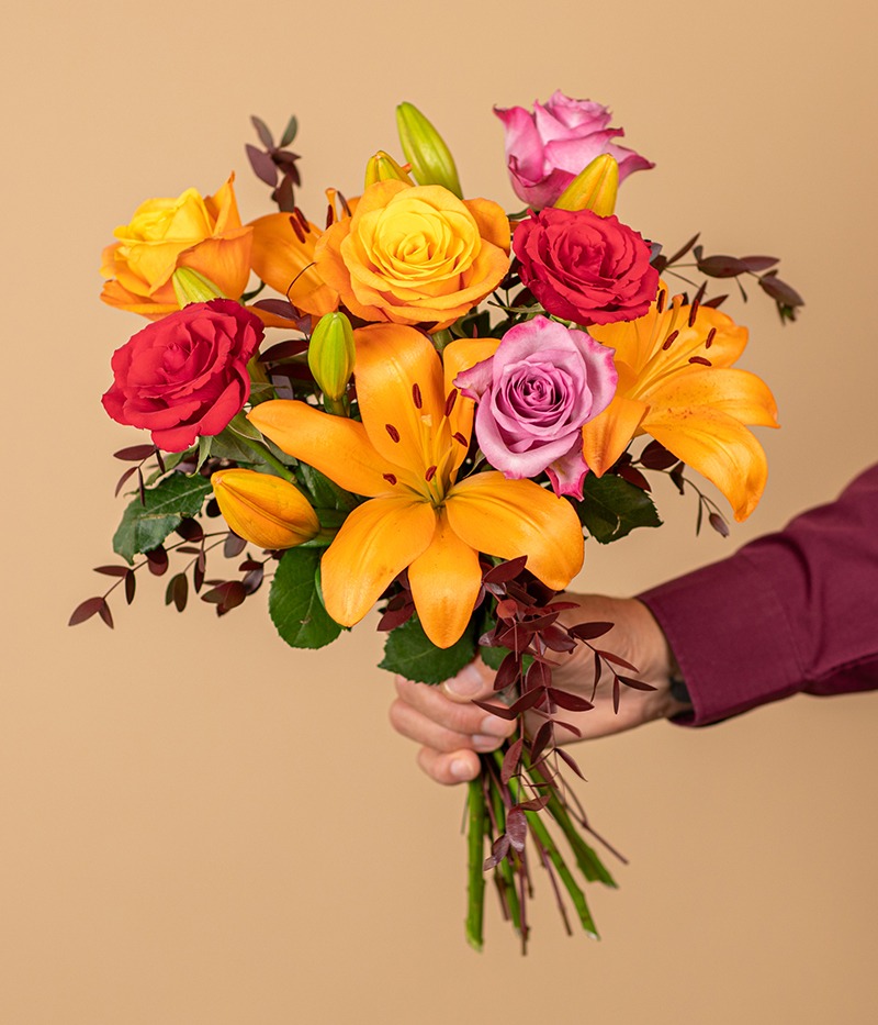 Autumn bouquets are built around warm, grounding shades. Think of roses in burnt orange, chrysanthemums glowing like miniature suns, and sprays of deep red lilies. Eflorist pairs these with textured greenery and berries to give arrangements a layered, seasonal richness. The effect is striking but never overdone — the perfect mix of rustic charm and elegance.