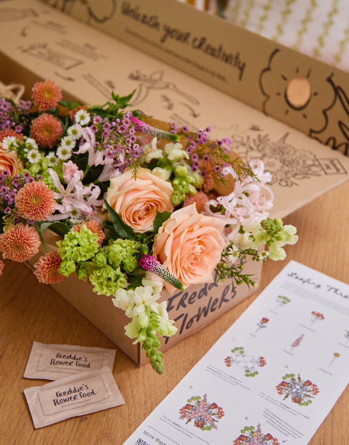 Alongside the flowers is the all-important guide. It’s an A4 sheet of paper with a note from Freddie (the founder) and a beautifully illustrated, step-by-step tutorial. It tells you which stems to cut, how long to cut them, and the exact order to put them in the vase.